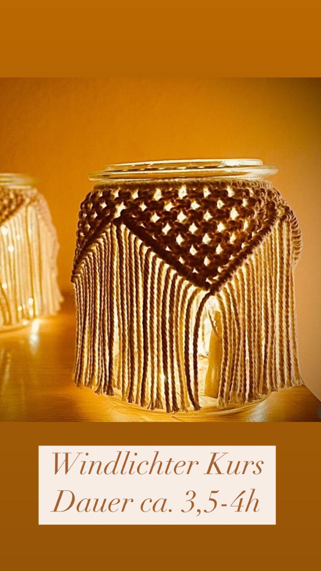 An diesem Abend lernt Ihr drei verschiedene Knotentechniken kennen und haltet am Ende des Abends euer eigenes Makramee-Windlicht in den Händen.